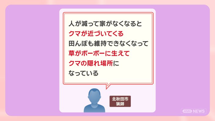 「人が減って家がなくなると、クマが近づいてくる。田んぼも維持できなくなって、草がボーボーに生えて、クマの隠れ場所になっている」と話しています。