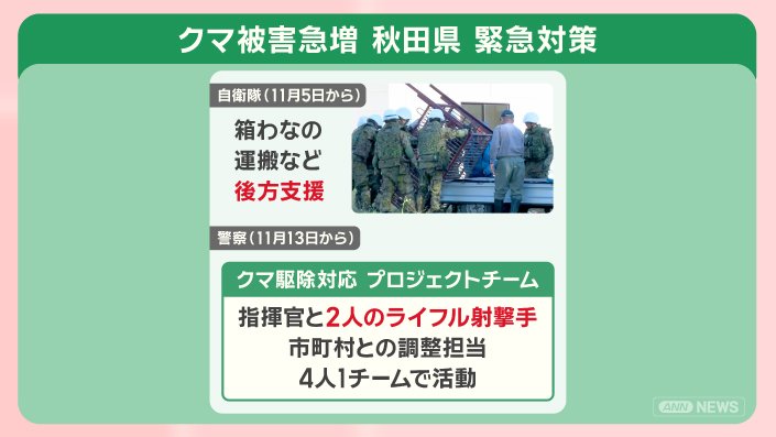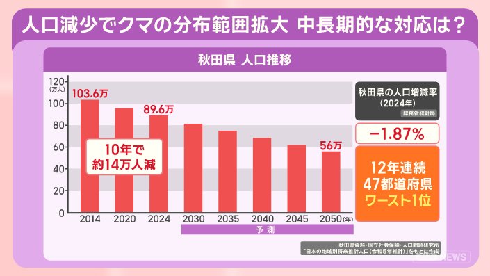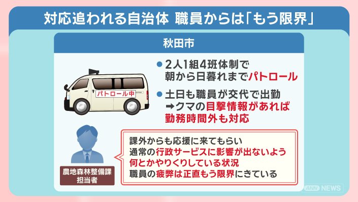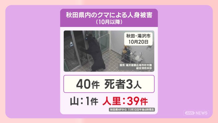 「例年11月になれば人身被害は減っていくのですが、今年に限っては出没が衰えを見せない、未だに町の中心部に出ているという状況です。これまでも人身被害はあったんですけども、今年や一昨年の異常さは町中に出てしまうというところで、それが県民の皆さんの不安を招いているところです。(秋田県に)20年近く住んでいますが、クマが増えたと感じたのは、一昨年です。一昨年70人という被害が出て、こんな所に出てくるのかという所に、クマが出てくるようになった。今回は、全県、一昨年よりもはるかに町中の、ここに出るんだったら、どこに出てもおかしくないという所に出るようになったという状況です」
