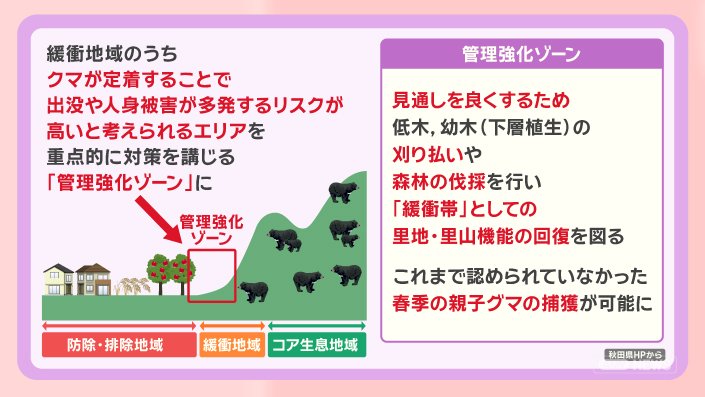 秋田県では、人里での被害を防ぐために、奥山をクマの『コア生息地域』、人が日常生活を送り、クマの侵入を許さない場所を『防除・排除地域』、その間を『緩衝地域』と定めました。