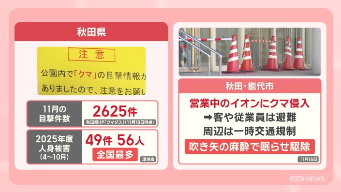 能代市では、11月16日、営業中のイオンにクマが侵入し、客や従業員が避難する事態となり、周辺は一時、交通規制が行われました。