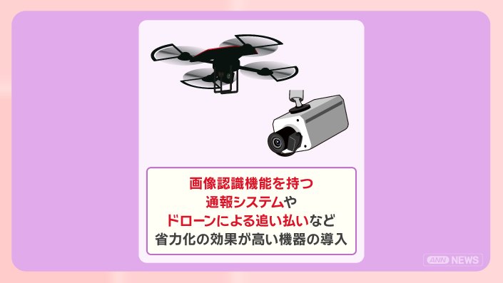人口減少の中で、人手をかけない対策として、画像認識機能を持つ通報システムや、ドローンによる追い払いなど、省力化の効果が高い機器の導入を進めています。