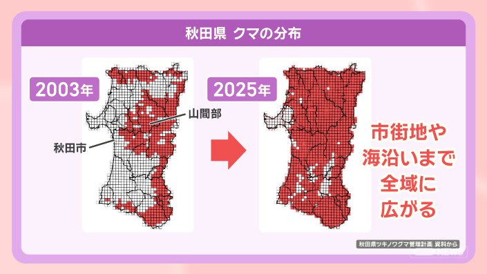 2003年には、山間部中心だったクマの出現場所が、2025年は、市街地や海沿いまで県内全域に広がっています。
