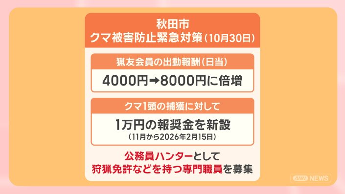 秋田市でも、クマ被害防止緊急対策として、猟友会員の出動報酬を日当4000円から8000円に倍増。