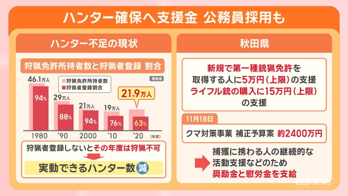 「秋田県でも(ハンターの数は)当然減っています。ピーク時からいくと4分の1以下ですね。狩猟免許の登録者数ベースでそれくらい。それプラス、昨年で1760人ほどになってるんですけども、全員がやはり駆除に出れるわけではないと、平日日中でもクマは出ますので、お仕事持っている方については出てきてくださらない、ということですから、やはり国の対策パッケージでも、退職自衛官、退職警察官というところがクローズアップされていますが、動けるタイプの方がこういったところに参加していただくというのは、すごく大事なことだろうと思っています。ただ、先ほど報奨金の金額が出ていましたが、やってくださっている重さとか危険さに比べて安いだろうというお声はいただきます。私もそう思うんですけども、自治体の財政状況、かなり厳しい中でやっているということで、ハンターの皆さんにはご理解いただきながらやっているんですが、そこを国の方もみていただきたいなと思います。(国の援助)ありますが、基本的に市町村に対してのものはないので、自腹の部分というのは結構あります」