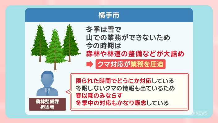 冬の間は、雪で山での業務ができないため、今の時期は森林や林道の整備などが大詰めですが、クマへの対応が業務を圧迫しています。