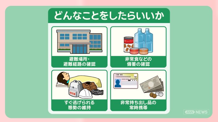 「1週間程度、特に今後2、3日間は、今回の地震と同じ、最大震度6強程度の地震に注意してほしい。今回の地震発生場所は、過去に地震が続発した事例がある。場合によっては、さらに強い揺れが発生する恐れもある」と注意を呼びかけています。