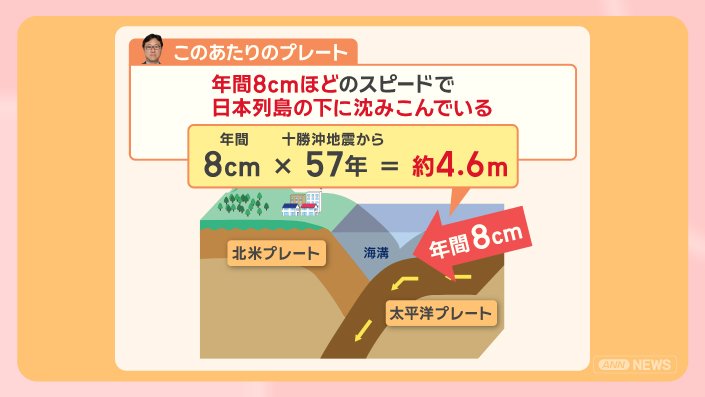 「このあたりのプレートは、年間8cmほどのスピードで、日本列島の下に沈み込んでいる」といい、十勝沖地震発生からの57年で、約4. 6mプレートが沈んでいることになります。