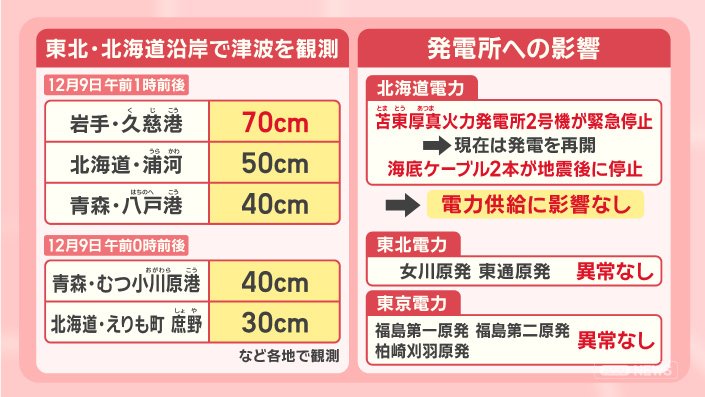 12月9日午前1時前後に、岩手・久慈港で70cm、北海道・浦河で50cm、青森・八戸港で40cm。