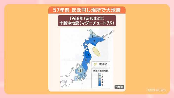 約60年前の1968年(昭和43年)には、今回地震が起きたほぼ同じ場所で、マグニチュード7. 9の十勝沖地震が発生しています。