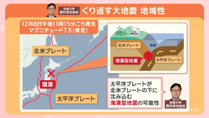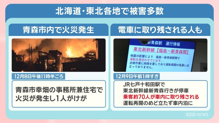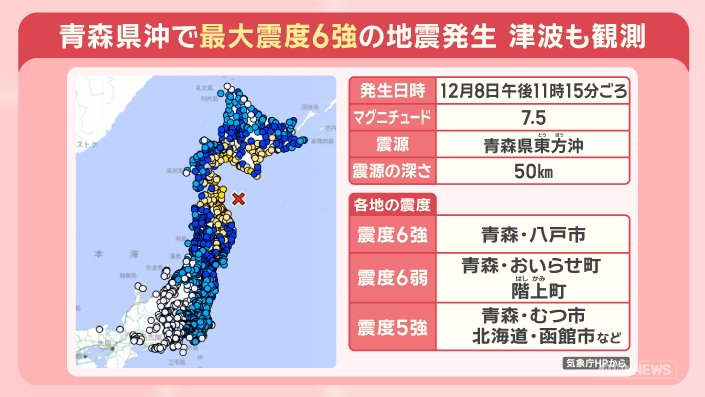 12月8日、午後11時15分ごろ発生した地震は、マグニチュード7. 5、震源は青森県・東方沖で、震源の深さは50kmと推定されています。