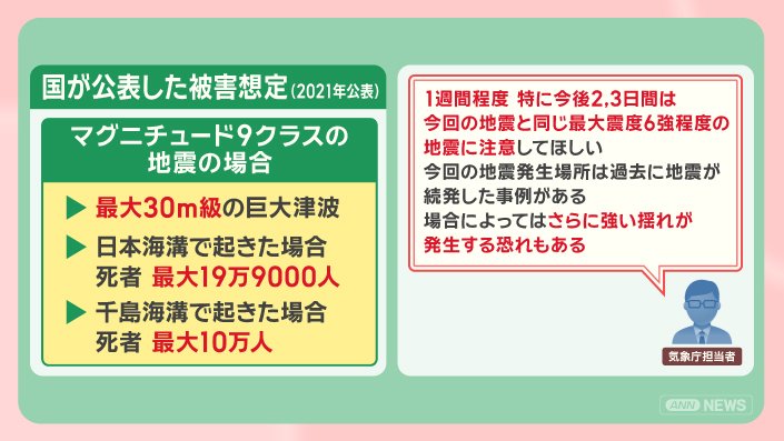 マグニチュード9クラスの地震の場合、最大30m級の巨大津波が発生し、日本海溝で起きた場合は、死者最大19万9000人、千島海溝で起きた場合は、最大10万人の死者が出ると想定されています。