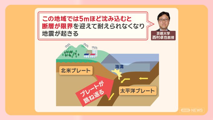 「この地域では、(プレートが)5mほど沈み込むと、断層が限界を迎えて耐えられなくなり、地震が起きる」ということです。