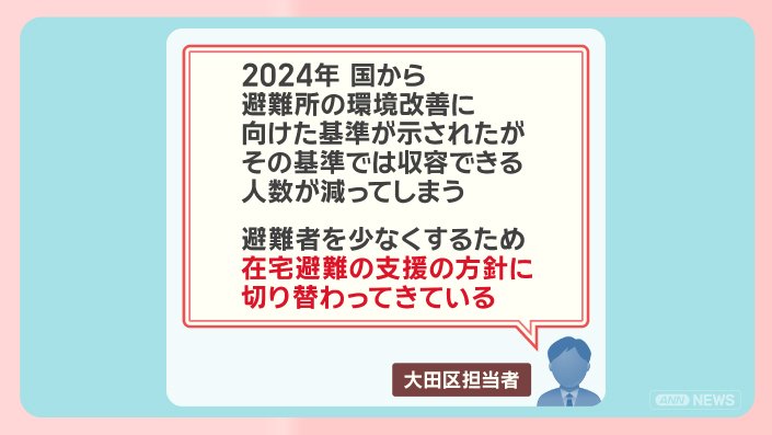 「2024年、国から避難所の環境改善に向けた基準が示されたが、その基準では収容できる人数が減ってしまう。避難者を少なくするため、在宅避難の支援の方針に切り替わってきている」