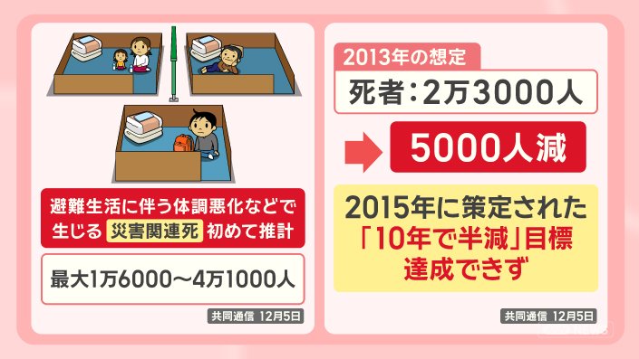 2013年の想定では死者数は2万3000人と想定されており、今回の想定では5000人減ったのですが、2015年に策定された『10年で半減』という目標は達成されませんでした。