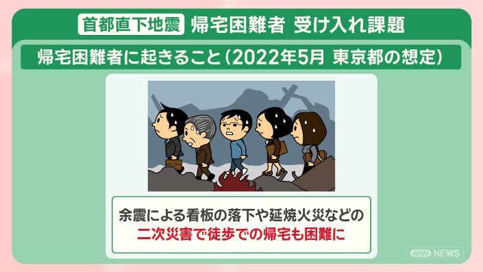 電車などが止まり、帰宅困難者となった人は、余震による看板の落下や、延焼火災などの二次災害で徒歩での帰宅も困難になります。