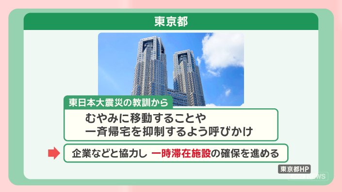 このような状況をなるべく作らないために東京都は、東日本大震災の教訓から、帰宅困難者がむやみに移動することや一斉帰宅するのを抑制するよう呼びかけています。