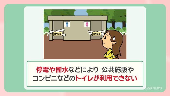 停電や断水により公共施設やコンビニなどのトイレが利用できないという状況も想定されます。