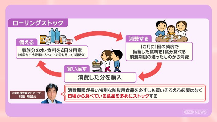 「消費期限が長い特別な防災用食品を必ずしも買いそろえる必要はなく、日頃から食べている食品を多めにストックする」ということです。