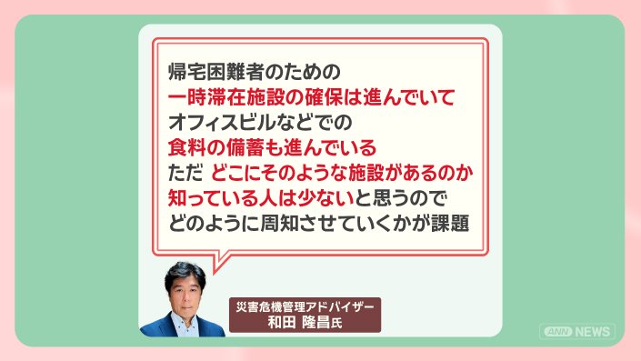 「帰宅困難者のための一時滞在施設の確保は進んでいて、オフィスビルなどでの食料の備蓄も進んでいる。ただ、どこにそのような施設があるのか知っている人は少ないと思うので、どのように周知させていくかが課題」