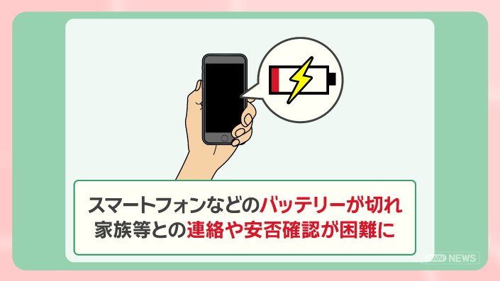 スマートフォンなどのバッテリーが切れ、家族等との連絡や安否確認が困難になります。