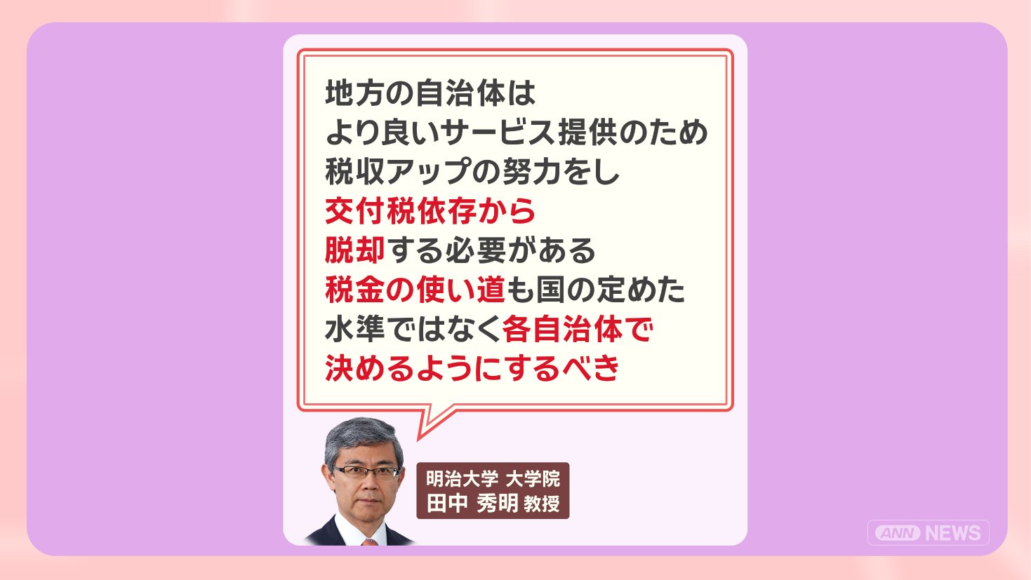 「地方の自治体は、より良いサービス提供のため税収をアップする努力をして、交付税への依存から脱却する必要がある。税金の使い道も、国の定めた水準ではなく、各自治体で決めるようにするべき」