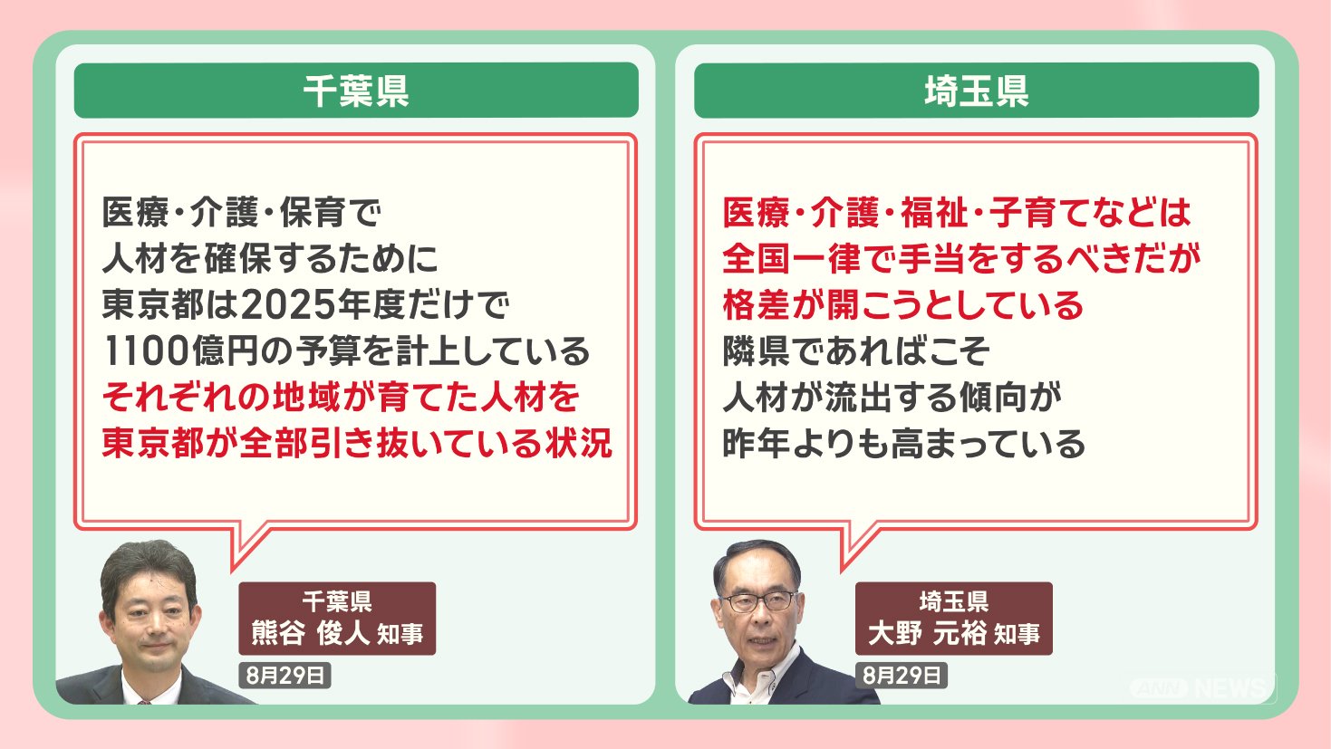 「医療・介護・保育で人材を確保するために、東京都は2025年度だけで、1100億円の予算を計上している。それぞれの地域が育てた人材を東京都が全部引き抜いている状況」としています。