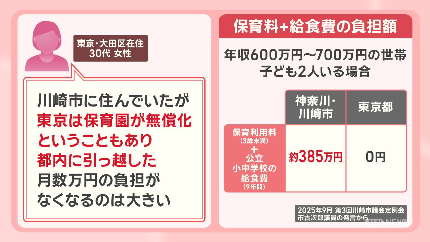 年収600万円〜700万円の世帯で子どもが2人いる場合、3年間の保育料と公立の小中学校の9年間の給食費を合わせた負担額は、川崎市で約385万円ですが、東京は0円です。