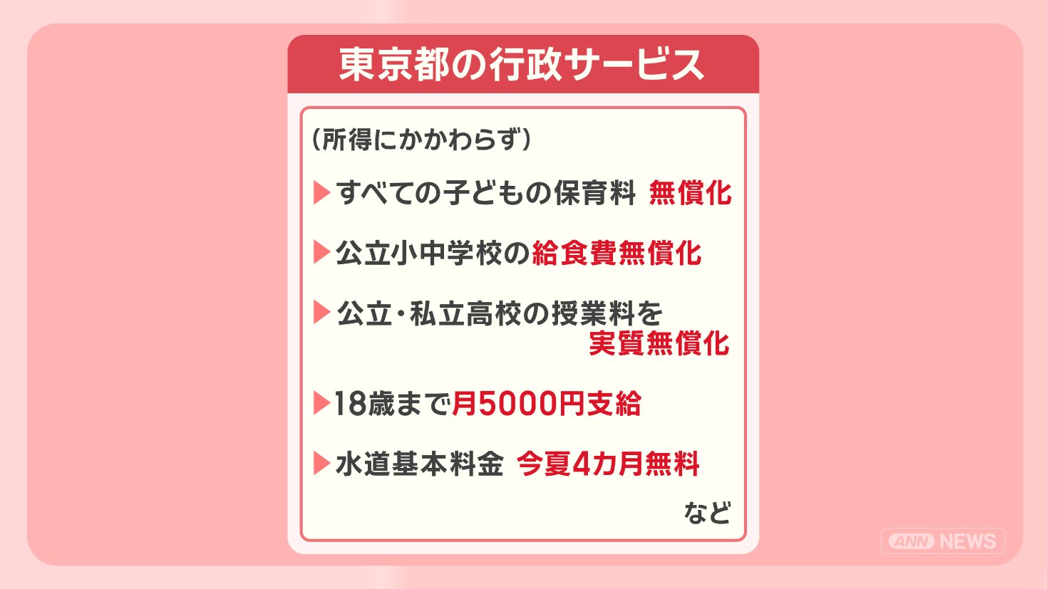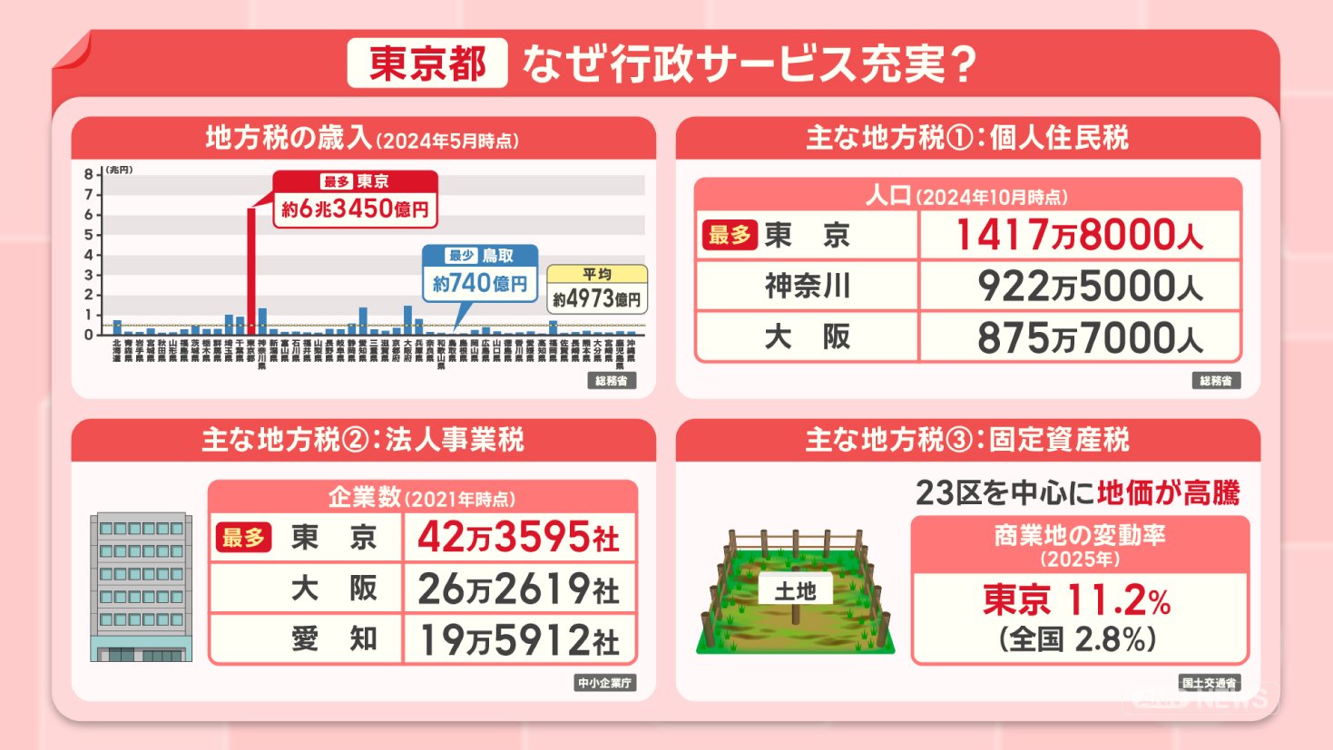 独自施策にあてられる住民1人あたりの金額は、46道府県が平均7万8000円なのに対し、東京都は28万1000円で、約3. 6倍という試算もあります。