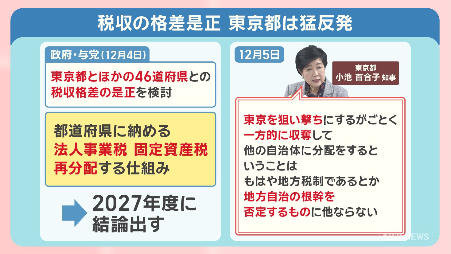 政府・与党は、東京都と他の46道府県との税収格差の是正を検討しています。