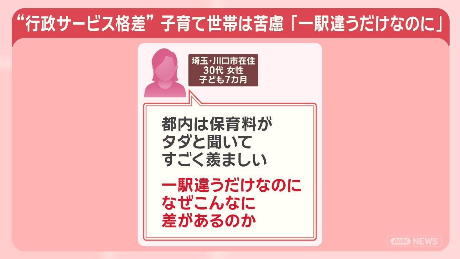 「都内は、保育料がタダと聞いてすごく羨ましい。一駅違うだけなのに、なぜこんなに差があるのか」