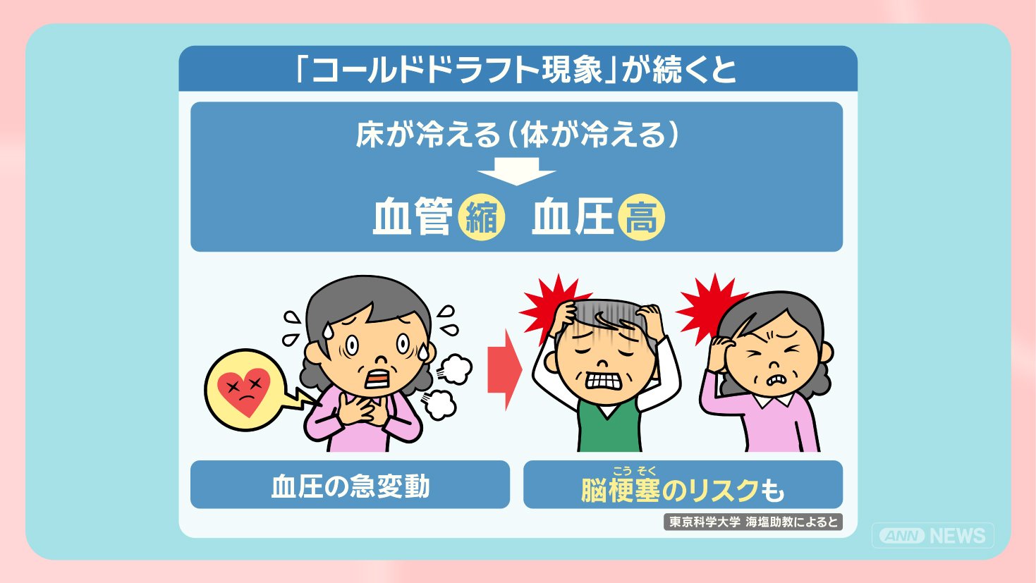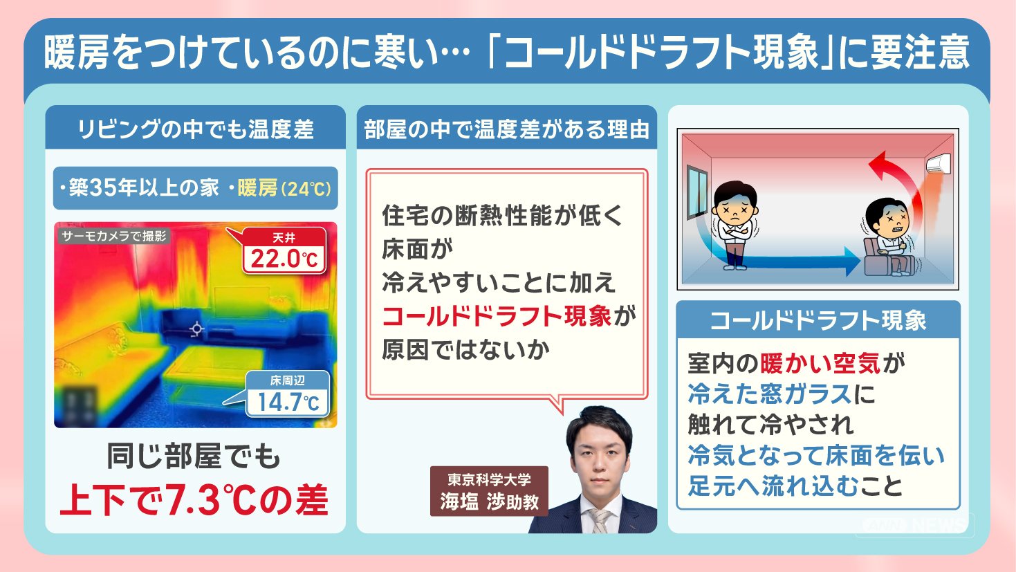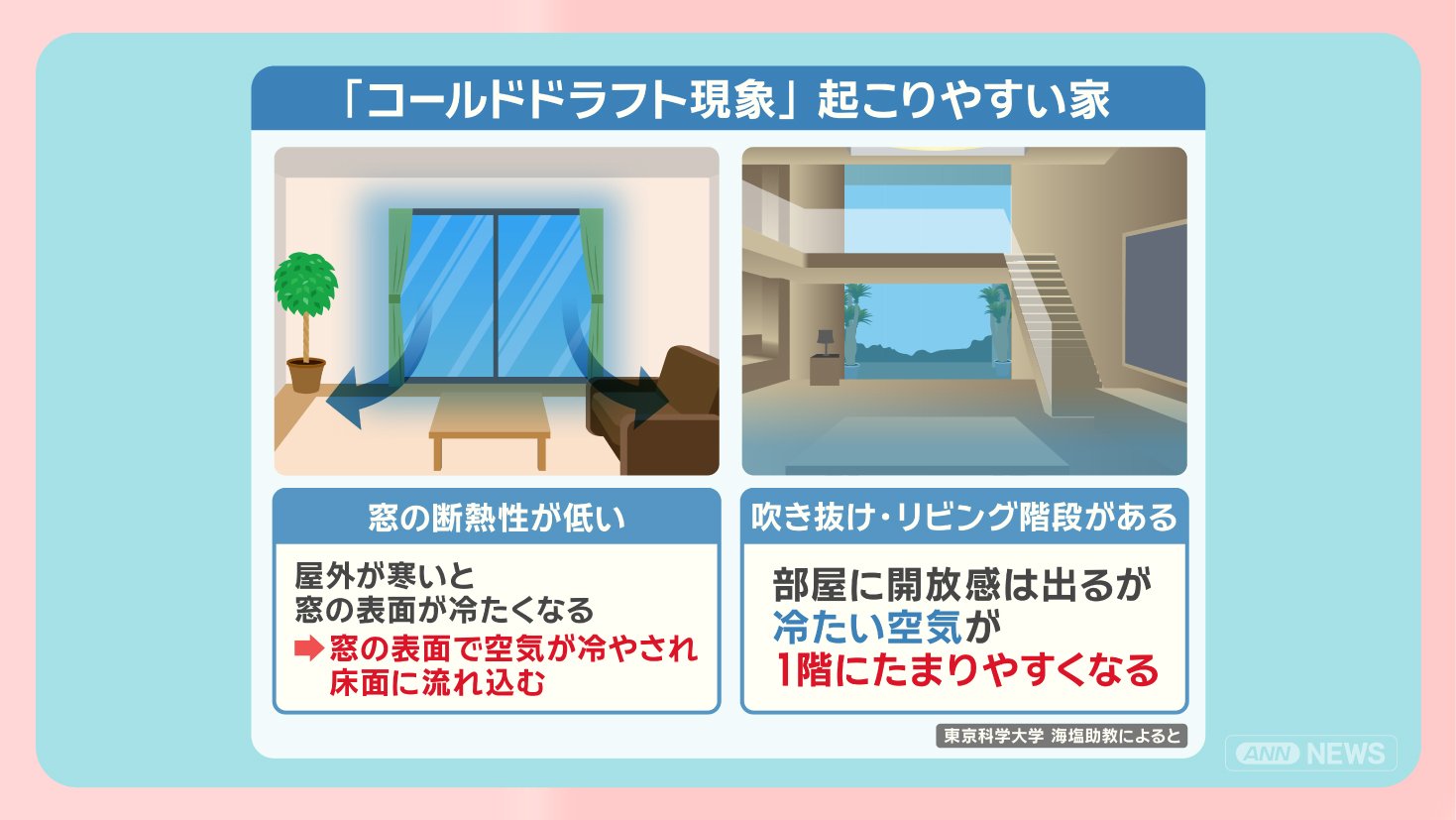 「住宅の断熱性能が低く、床面が冷えやすいことに加え、コールドドラフト現象が原因ではないか」といいます。