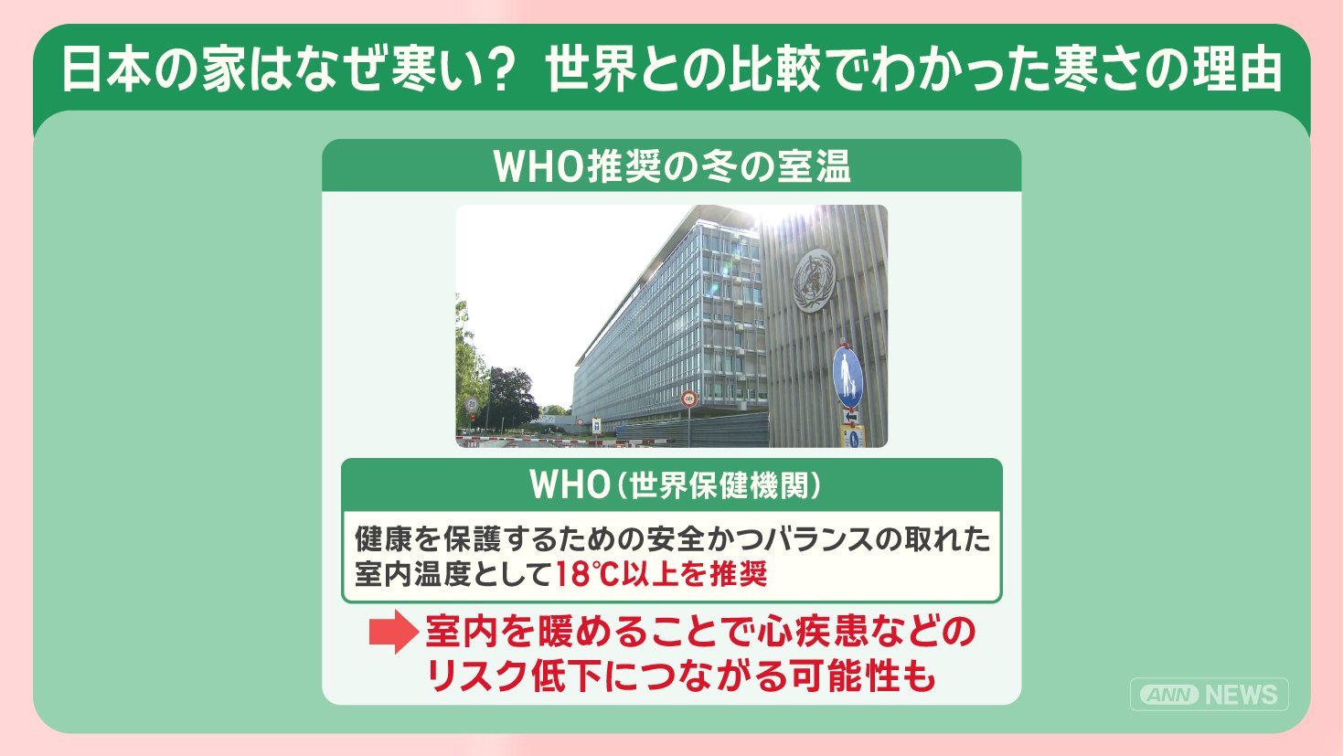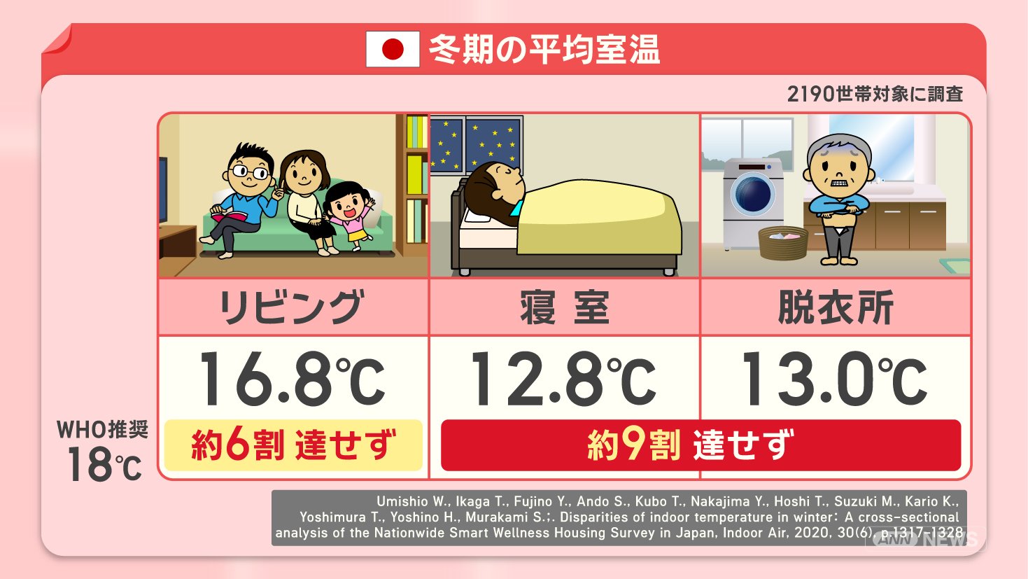 2190世帯を対象に行われた調査によると、日本の冬の室内の平均室温はリビングが16. 8℃と、WHOが推奨する18℃には、約6割の世帯が達していません。