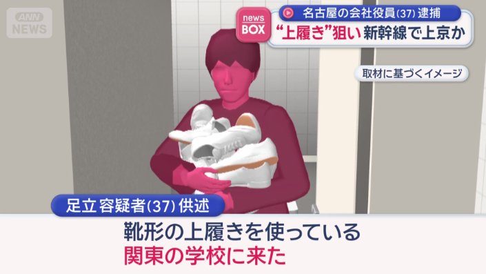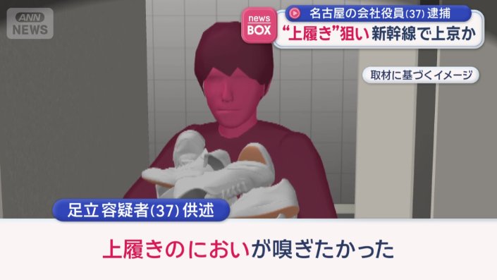 社会 スーパーJチャンネル 2025年12月8日 19:44 「上履きの匂い」求めて上京か 「愛知はスリッパなので」会社役員逮捕 2025年12月8日 19:44 写真 (1/5) なぜ名古屋から千葉へ? 写真の記事を読む 広告 写真 (2/5) 教師が中を確認すると… 写真の記事を読む 写真 (3/5) 上履き5足を持ち込む 写真の記事を読む 写真 (4/5) 名古屋市の自称・会社役員を逮捕 写真の記事を読む 広告 写真 (5/5) 名古屋から新幹線で上京 写真の記事を読む シェア スクープ投稿 この記事を読む トップ 社会 事件・事故・裁判 ギャラリー
