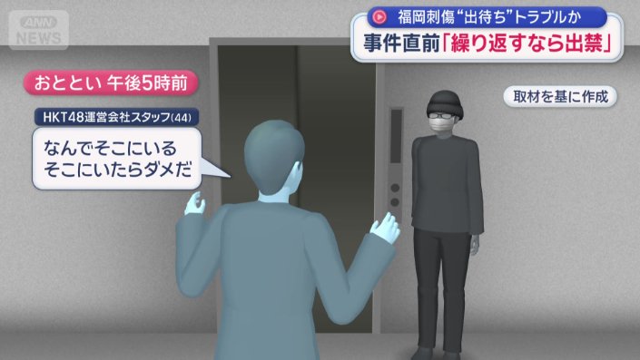 社会 スーパーJチャンネル 2025年12月16日 19:21 福岡刺傷“出待ち”トラブルか 事件直前男に「繰り返すなら出禁」警告 2025年12月16日 19:21 写真 (1/5) 事件現場から約12キロ離れたコンビニで、自ら警察に通報 写真の記事を読む 広告 写真 (2/5) 容疑者はHKT48のイベントの常連客 写真の記事を読む 写真 (3/5) 駐車場のエレベーターホールに1人でいる姿をイベントスタッフが確認 写真の記事を読む 写真 (4/5) 容疑者が常連客だったため顔を認識、声を掛けた 写真の記事を読む 広告 写真 (5/5) 山口容疑者の自宅は… 写真の記事を読む シェア スクープ投稿 この記事を読む トップ 社会 事件・事故・裁判 ギャラリー