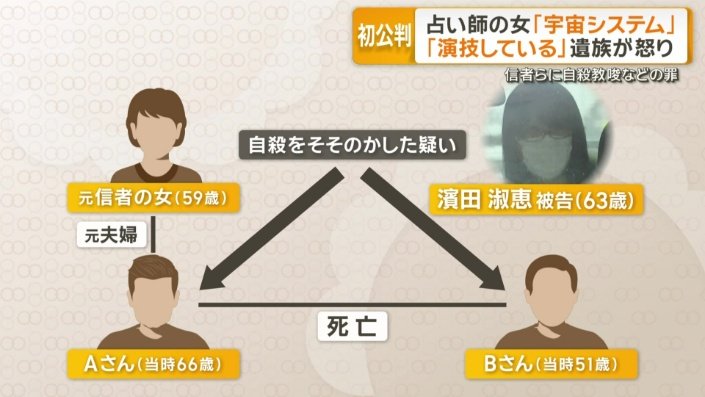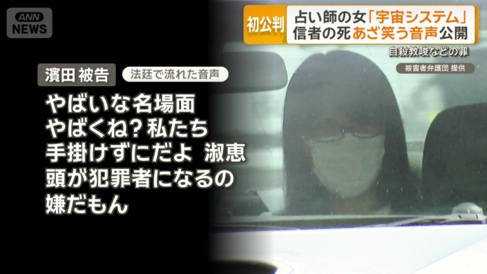 社会 グッド!モーニング 2025年12月18日 12:49 「やばくね?」信者の死あざ笑う音声公開 自称占い師の女の初公判 自殺教唆などの罪 2025年12月18日 12:49 写真 (1/5) 自称占い師の濱田淑恵被告(63) 写真の記事を読む 広告 写真 (2/5) 証拠として提出された事件後に信者と交わした会話の音声 写真の記事を読む 写真 (3/5) AさんとBさんに自ら命を絶つよう仕向けたか 写真の記事を読む 写真 (4/5) 「私自身の身体を介して宇宙システムというのがある」 写真の記事を読む 広告 写真 (5/5) 「神の仕業と言って演技をして許せない」遺族 写真の記事を読む シェア スクープ投稿 この記事を読む トップ 社会 事件・事故・裁判 ギャラリー