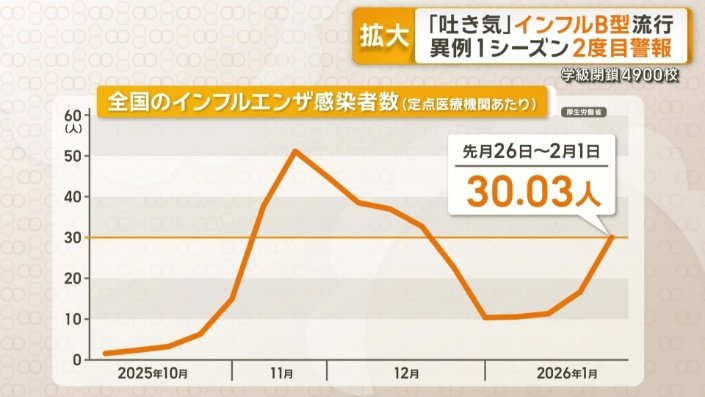 社会 グッド!モーニング 2026年2月13日 10:38 「吐き気」インフルB型流行 異例の1シーズン2度目警報 症状が似る感染性胃腸炎も 2026年2月13日 10:38 写真 (1/4) 全国のインフルエンザ感染者数の推移 写真の記事を読む 広告 写真 (2/4) いとう王子神谷内科外科クリニックの伊藤博道院長 写真の記事を読む 写真 (3/4) 患者急増で一部の薬不足 写真の記事を読む 写真 (4/4) インフルB型とともに増えている胃腸炎 写真の記事を読む 広告 シェア スクープ投稿 この記事を読む トップ 社会 医療・健康 ギャラリー