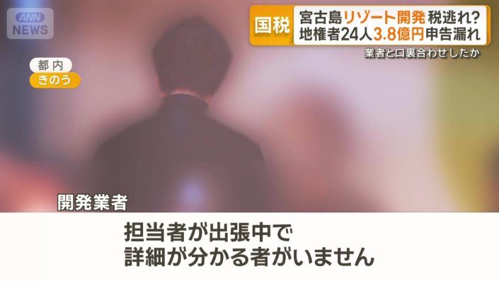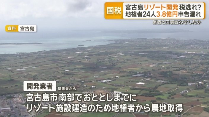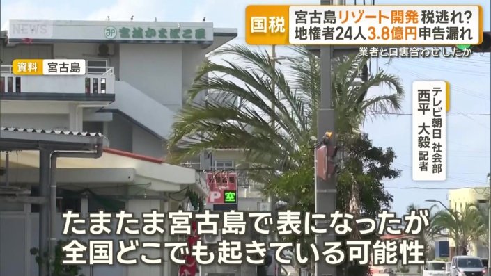 社会 グッド!モーニング 2026年3月24日 11:24 宮古島リゾート開発で税逃れ? 地権者24人が3.8億円申告漏れ 業者と口裏合わせか 2026年3月24日 11:24 写真 (1/5) リゾート開発業者に取材を申し込むと… 写真の記事を読む 広告 写真 (2/5) 地権者のうち24人 約3億8800万円を申告せず 写真の記事を読む 写真 (3/5) “税逃れ”を唆す 写真の記事を読む 写真 (4/5) 地権者は追徴課税が発生したが… 写真の記事を読む 広告 写真 (5/5) 同様の手口での税逃れ 写真の記事を読む シェア スクープ投稿 この記事を読む トップ 社会 ギャラリー