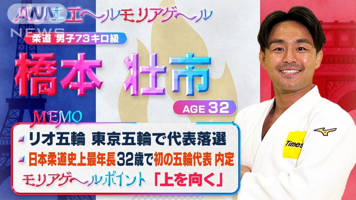 今年の7月26日に迫ったパリオリンピック開幕へ、日本人選手に“エールを送って盛り上げ”ていこうという「サンデーLIVE!!」スポーツのコーナー、題して「パリエエ〜ルモリアゲ〜ル」。選手たちにはパリオリンピックを盛り上げる「モリアゲ〜ルポイント」を教えてもらいます。第15回は、男子73キロ級の橋本壮市選手(32)に松木さんがインタビューしてくれました。橋本選手はリオ五輪と東京五輪と続けて落選し、その道のりは険しいものでした。