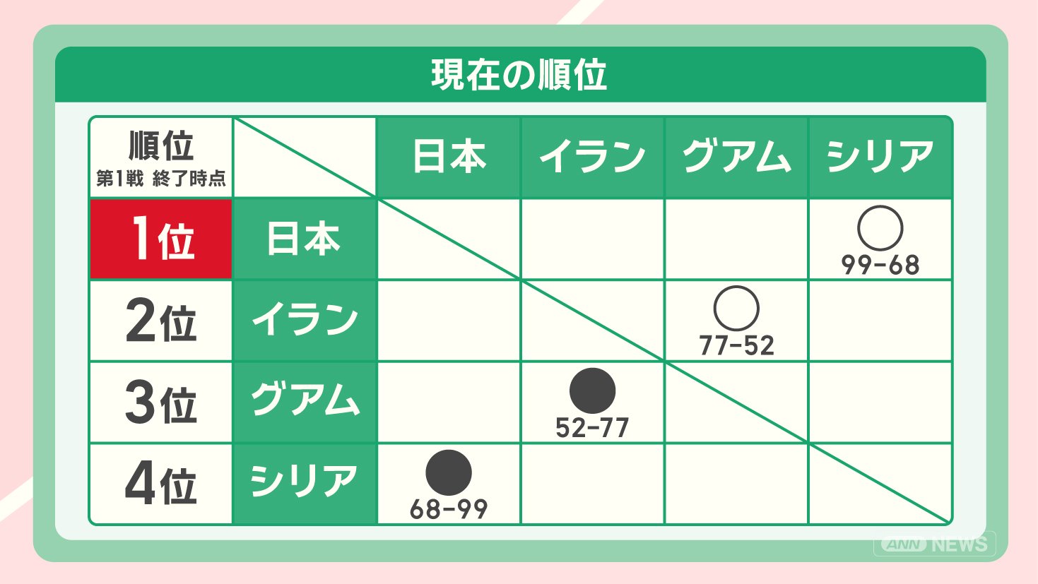 日本は1位。8月8日に対戦するイランが2位です。