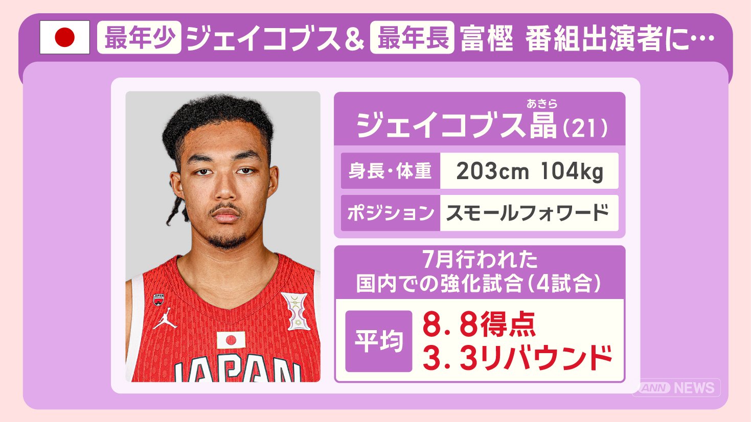 7月に行われた国内での強化試合では、平均8. 8得点、3. 3リバウンドでした。