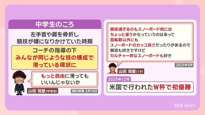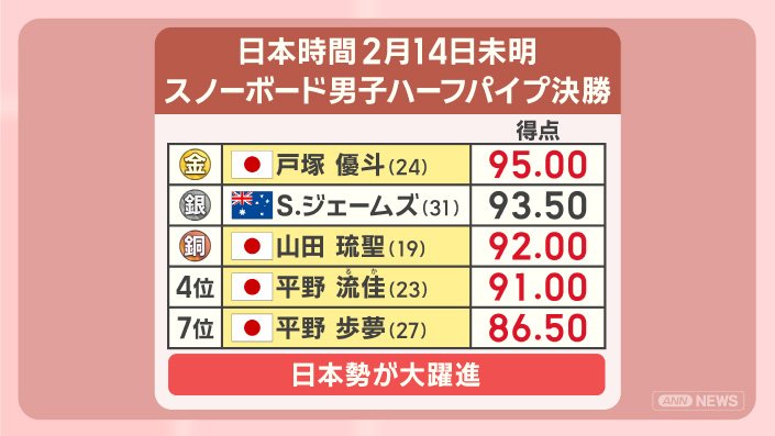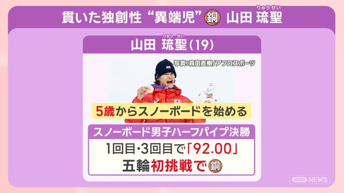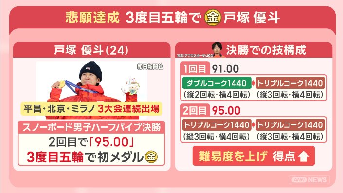 スポーツ モーニングショー 2026年2月17日 16:00 スノボ男子ハーフパイプ 金・銅メダル獲得で日本大躍進 激闘の舞台裏 広告 1■戸塚 過去2大会出場もメダルなし「悔しさバネに」悲願の金 この記事の写真は17枚 ■銅メダル山田琉聖「もっと自由に」貫いた独創性 ■平野歩夢は7位入賞 独占インタ けがからの復活&今後 ■スノボ スロープスタイル メダリスト続々登場 注目は? (「羽鳥慎一モーニングショー」2026年2月16日放送分より) 広告 スクープ投稿 トップ スポーツ 記事