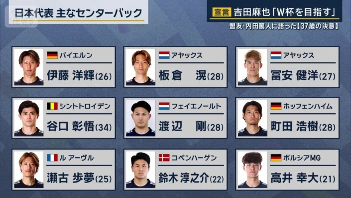 日本代表の主なセンターバック
