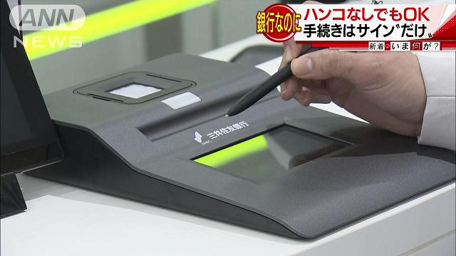 ハンコがなくても、サインだけで手続きできる銀行がオープンしました。 17日にオープンした三井住友銀行の新型店舗の特徴は「ペーパーレス」です。あらかじめ登録をすれば、サインの筆跡や文字を書くスピードで本人確認ができるため、ハンコがなくても内容を口頭で伝えてサインするだけで口座の開設や預金の引き出しなどができます。また、ハンコを押す場合も書類は使わず、特殊な機械で読み取ります。そのため新店舗では、初めて店内から記帳台を撤去しました。さらに、時間がかかる取引には対面式ではなく、横に並んで手続きをする「寄り添い型」の窓口を初めて導入し、堅苦しさを減らす工夫をしています。