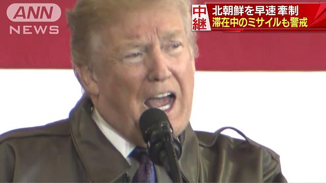 トランプ大統領の今回の訪問の一番の狙いは何なのでしょうか。 (山下達也記者報告) トランプ大統領の宿泊先はイバンカさんが宿泊していたホテルと同じですが、さらに警備が厳しくなりまして周辺が封鎖されています。今回、最大の焦点の北朝鮮問題ですが、早くもトランプ節も出ています。トランプ大統領は長旅の疲れも見せず、到着した直後の演説で北朝鮮を念頭にアメリカの決意を過小評価するな、あなどるなと早速、牽制(けんせい)しました。関係者によりますと、今回、北朝鮮をさらに威嚇して挑発行為を断念させたい考えで、6日の共同記者会見などで金正恩委員長を手厳しく非難する見通しです。これまで「リトル・ロケットマン」などの表現で侮辱しましたが、その辺もトランプ大統領自ら考えているということです。また、滞在中に北朝鮮のミサイル発射などがあった場合の対応策をホワイトハウスがすでに準備していると一部のアメリカメディアが報じました。安倍総理大臣との会談では、軍事行動になった場合の一般人保護の対応策や日本が具体的にどういった支援ができるのかという話にもなりそうです。関係者によりますと、トランプ大統領は日本の憲法改正や自衛隊の軍事的行動の拡大に非常に関心を持っているということで、かなりの要求が突き付けられるということもありそうです。